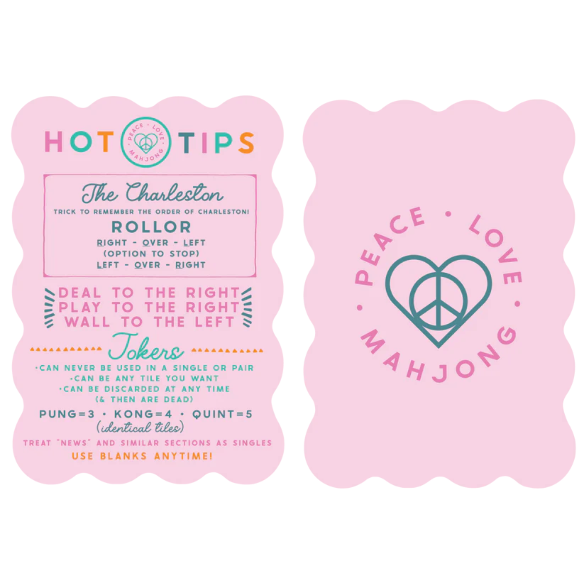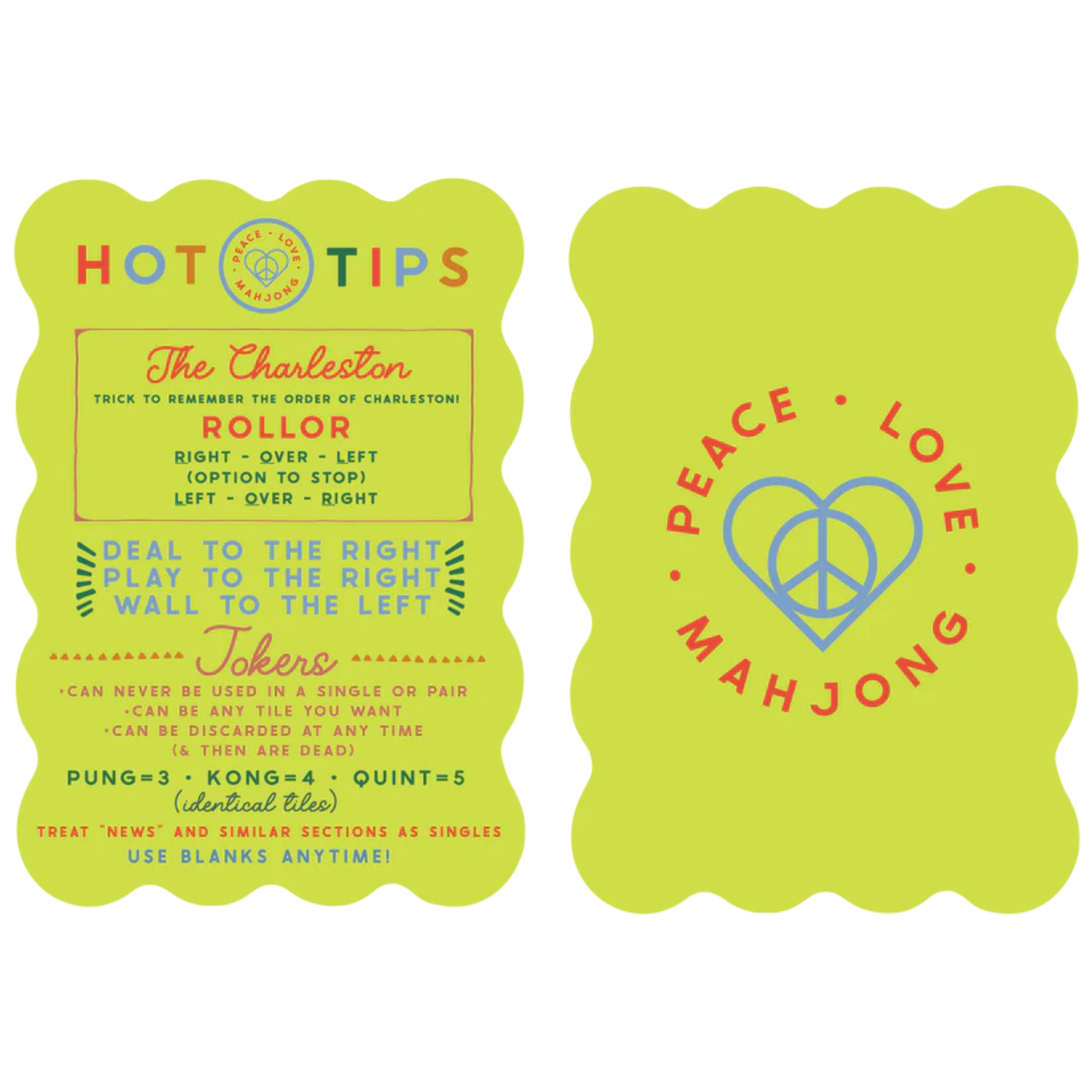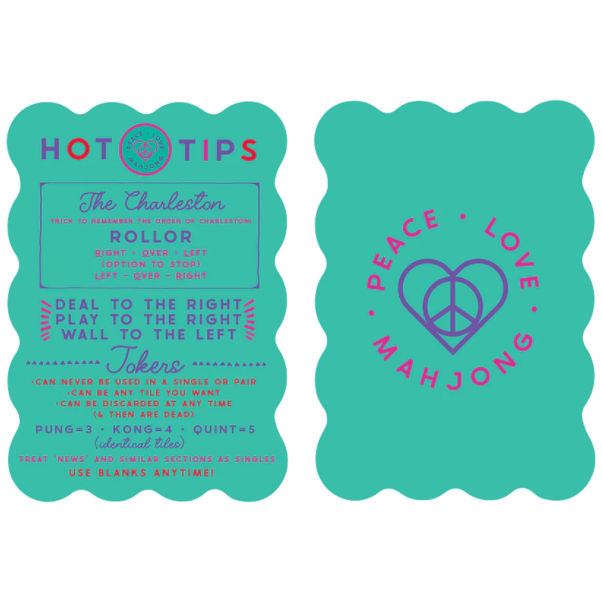 Shuffle smarter, not harder! Our Peace Love Mahjong Tile Shufflers keep the good vibes rolling and your game on point. These bright, playful cards are packed with handy tips and Charleston reminders — so you’ll never miss a beat (or a roll). Keep them at your table for an extra splash of color, peace, and love every time you play!