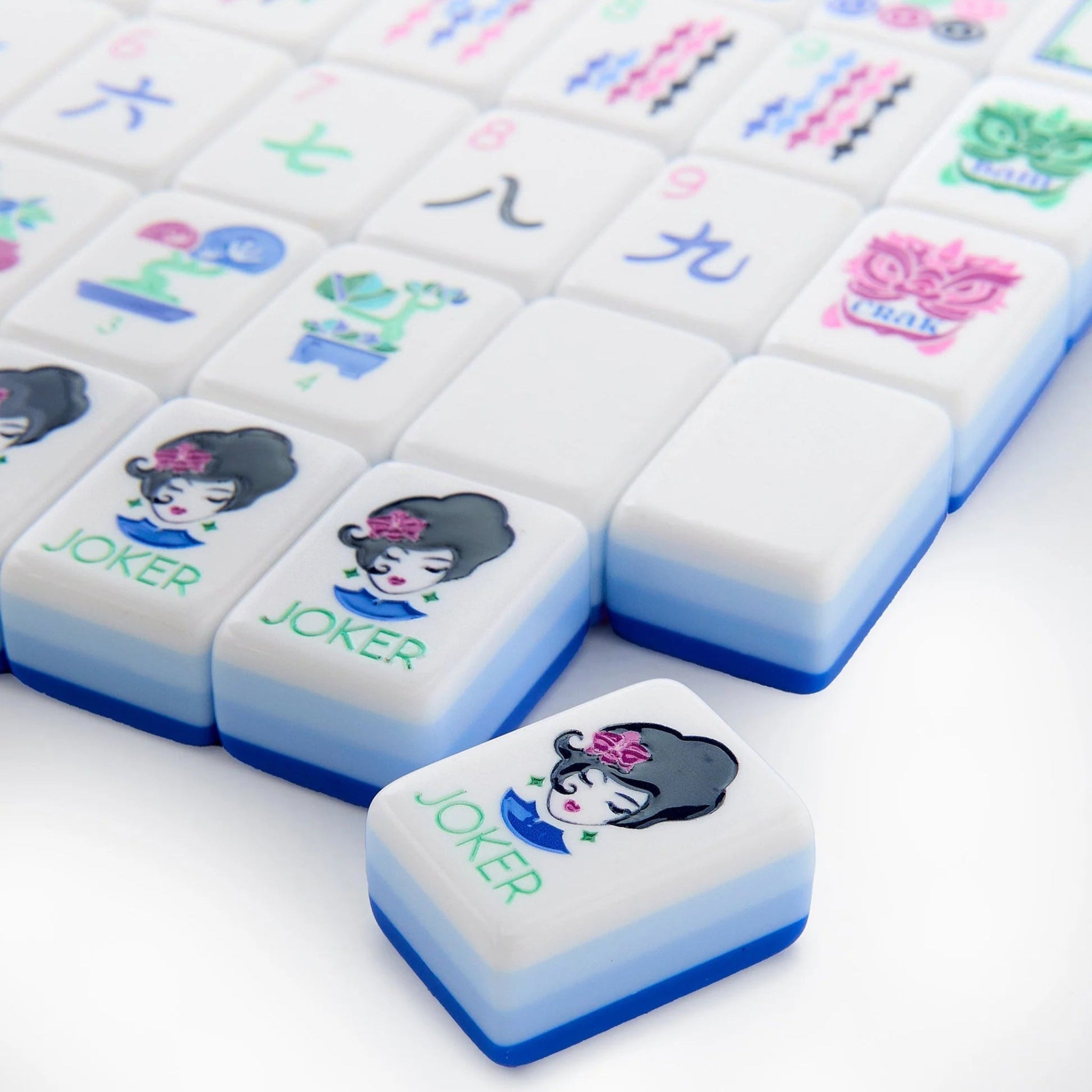 Where tradition meets vibrant colors, these Mahjong tiles are meticulously designed and hand-painted, blending classic elements with a modern twist. Featuring stripes in blue ombre, each tile boasts unique images that add a touch of elegance to your game.