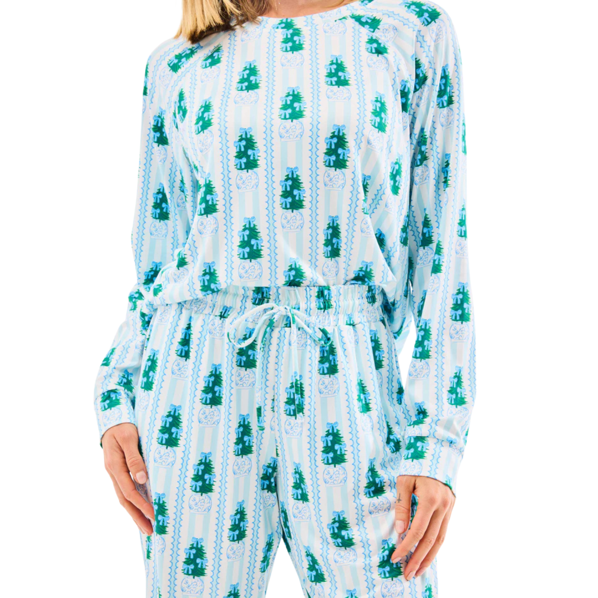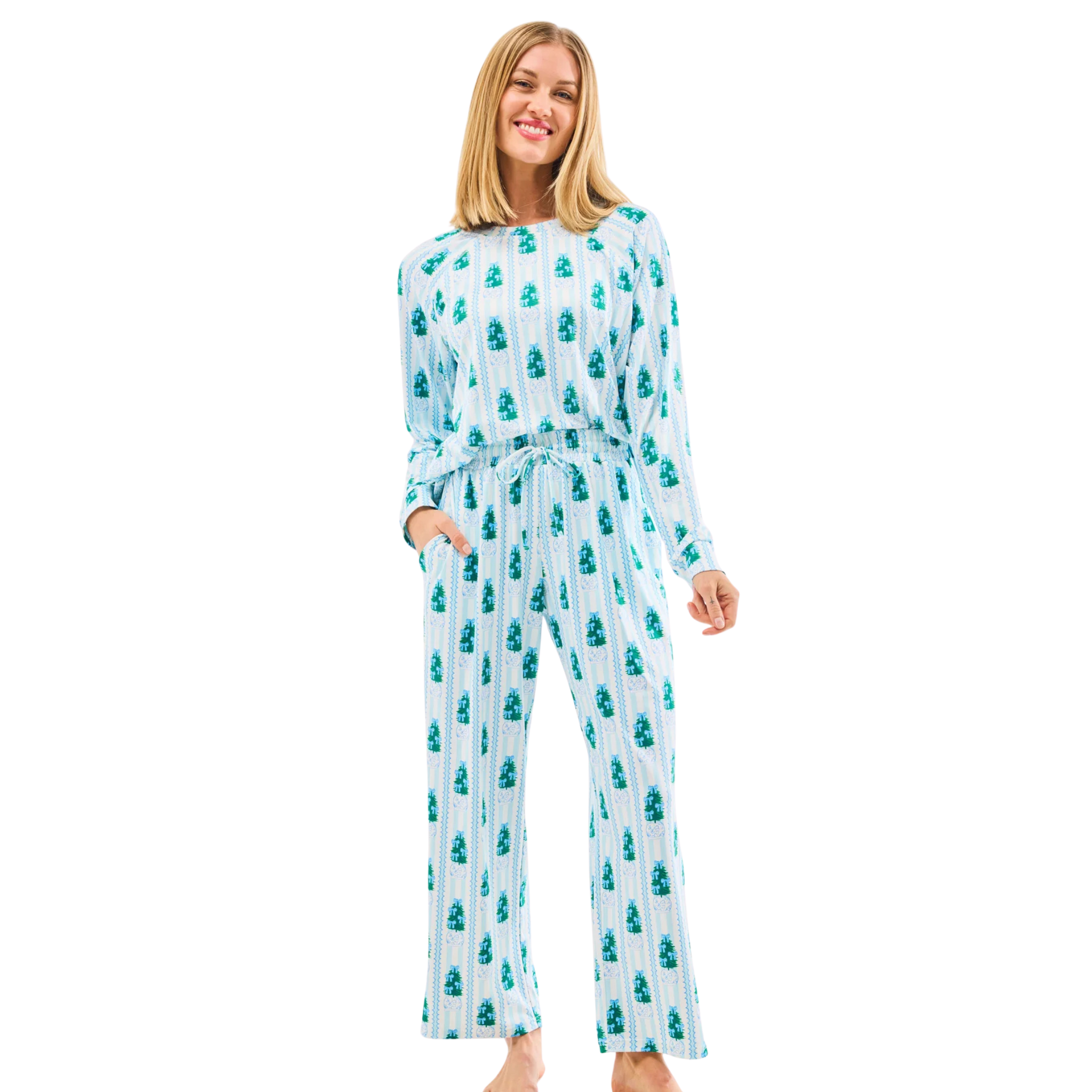Introducing the Holiday Annie Pajama Set, where comfort meets festive charm. Perfect for sipping cocoa by the tree or enjoying Christmas morning in cozy style, this pajama set brings holiday cheer to every moment. Featuring a long-sleeve top with a classic crew neckline and straight-leg pants with an adjustable drawstring, our Annie Pajama Set combines classic holiday style with all-day comfort.