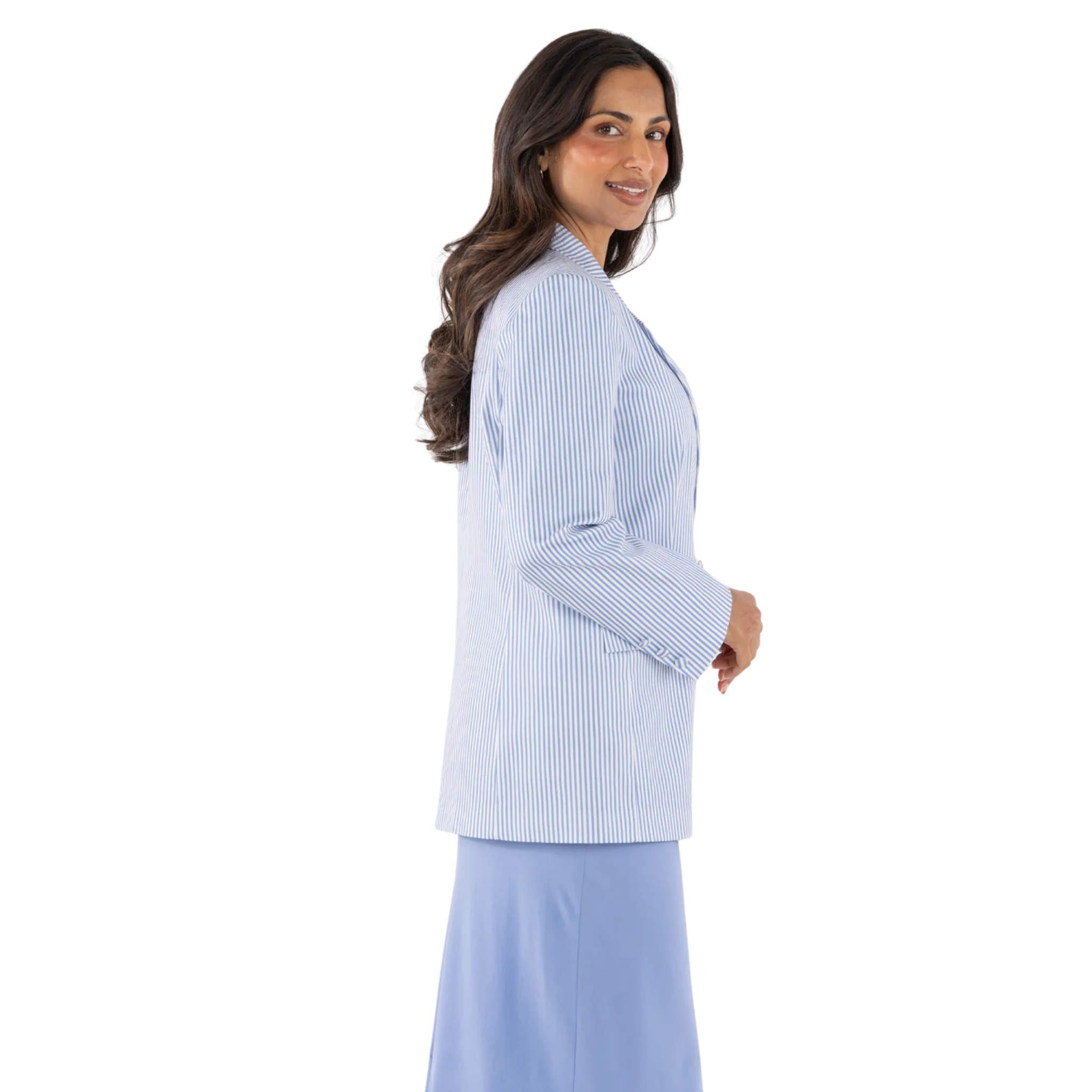 The Bristol Blazer in Grapemist Stripe is a modern take on a timeless classic. Designed with a relaxed yet slightly tailored silhouette, this double-breasted style features a classic lapel and clean lines for an effortlessly polished look. Inside, the blazer is lined with our iconic Joy print—revealed with a simple roll of the sleeve for an unexpected pop of playful, signature detail. Versatile by design, it transitions seamlessly from office-ready polish to casual days styled with denim or sneakers, making it a standout staple with personality.