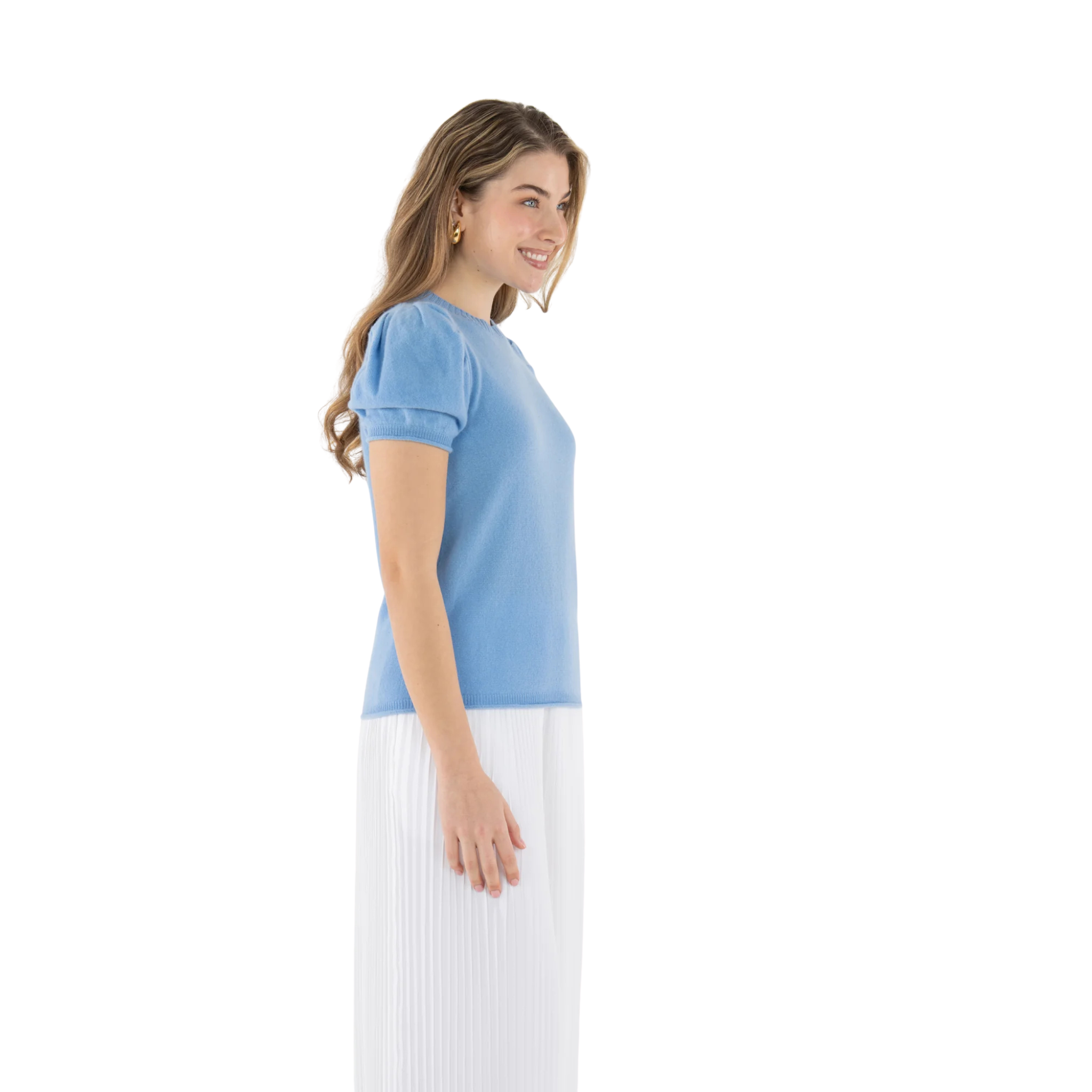 The Crewneck Knit in Nantucket Breeze is a foundational spring staple crafted in luxurious 100% cashmere. Featuring a classic crew neckline, softly puffed sleeves, and a subtly tailored silhouette, it offers an elevated yet easygoing approach to everyday dressing. Designed to be worn season after season, this knit blends enduring style with refined comfort.