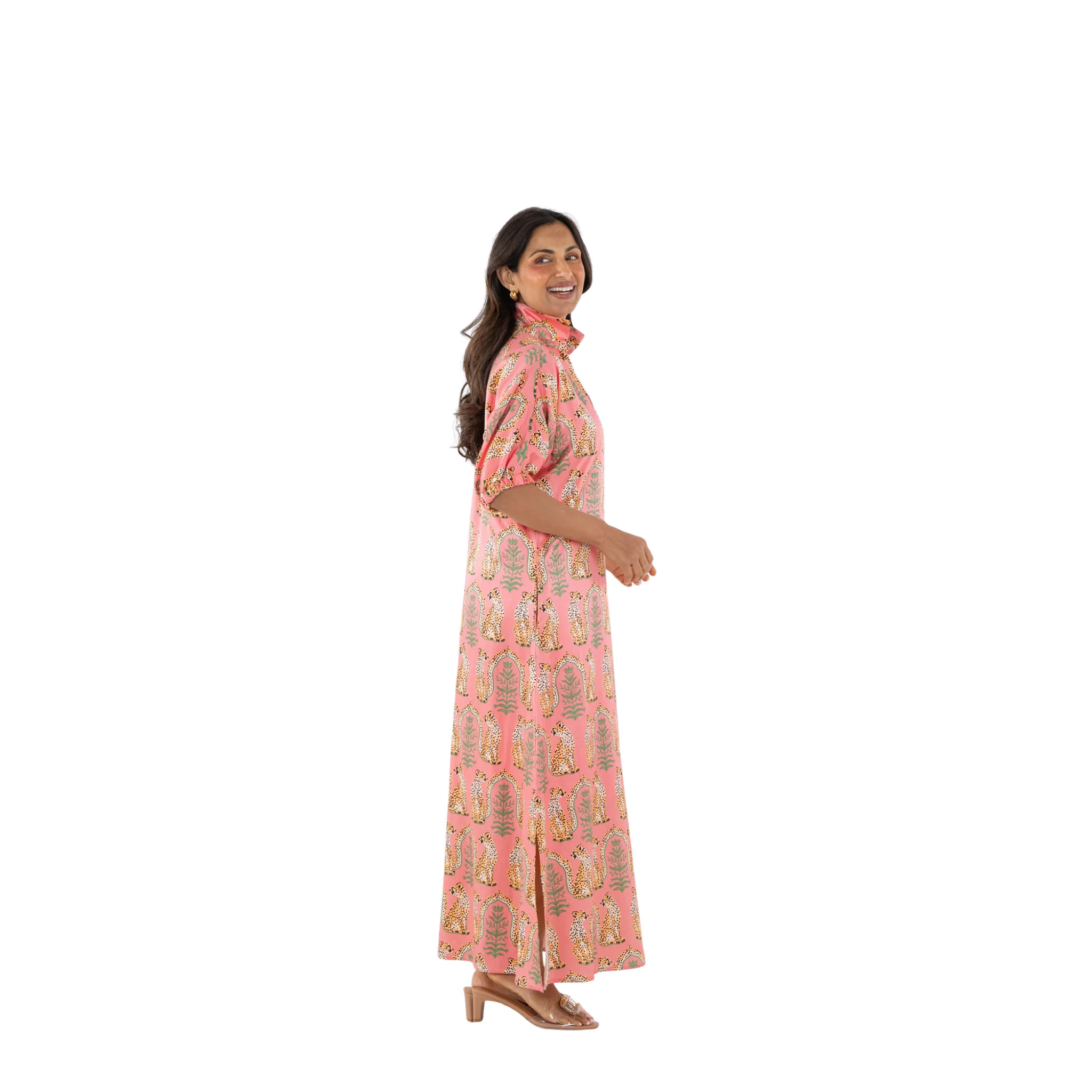 The Poppy Maxi in Cabana Cat is an understated statement with a playful edge. Designed with a classic stand collar, relaxed dolman sleeves with soft elastic, and a loose, flowing silhouette, it moves with ease and grace. The Cabana Cat print brings a sense of whimsical majesty, featuring regal cheetahs set within a symmetrical jungle of architectural motifs—perfect for elevated occasions that call for ease and impact.