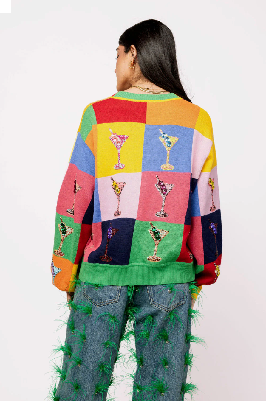 Shine bright in this glamorous Multi Checkered Cosmo Button Up Sweater. Sparkling details catch the light beautifully against the multicolored checkered pattern, while playful cosmo drink designs add a fun, sophisticated touch. The button-up silhouette keeps things polished and elegant, making it perfect for special occasions or when you want to feel extra fancy. Whether you're celebrating with friends or simply want to sparkle through your day, this sweater delivers style, comfort, and just the right amount of glam.