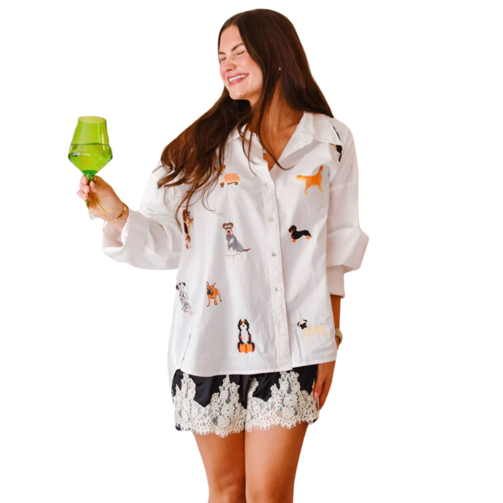 Bring playful sophistication to your wardrobe with this crisp white oxford shirt, embroidered with a charming assortment of dog breeds. Tailored yet whimsical, it’s a standout piece for animal lovers and design enthusiasts alike. Wear it tucked or oversized—it’s as versatile as it is conversation-worthy. Finished with classic detailing and just the right amount of personality.
