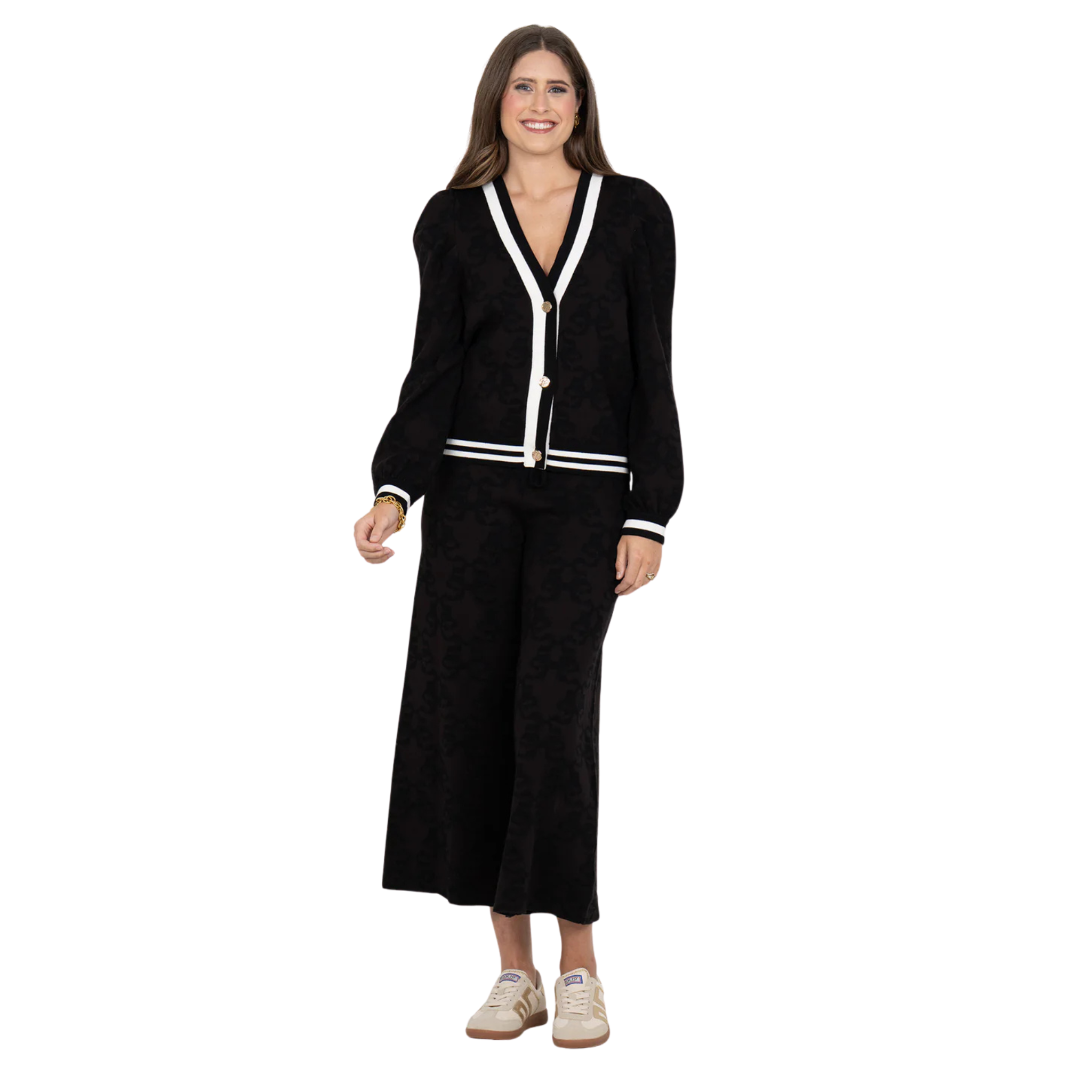 The Clara Cardigan in Bow Lattice features signature gold logo button closures, soft puff sleeves, and a slightly tailored silhouette for a feminine yet structured look. The tonal bow lattice motif adds dimension, while the black and white striped trim lends a signature branded touch. Pair it with the matching Teddy Crop Trouser for an effortlessly coordinated monochrome set.