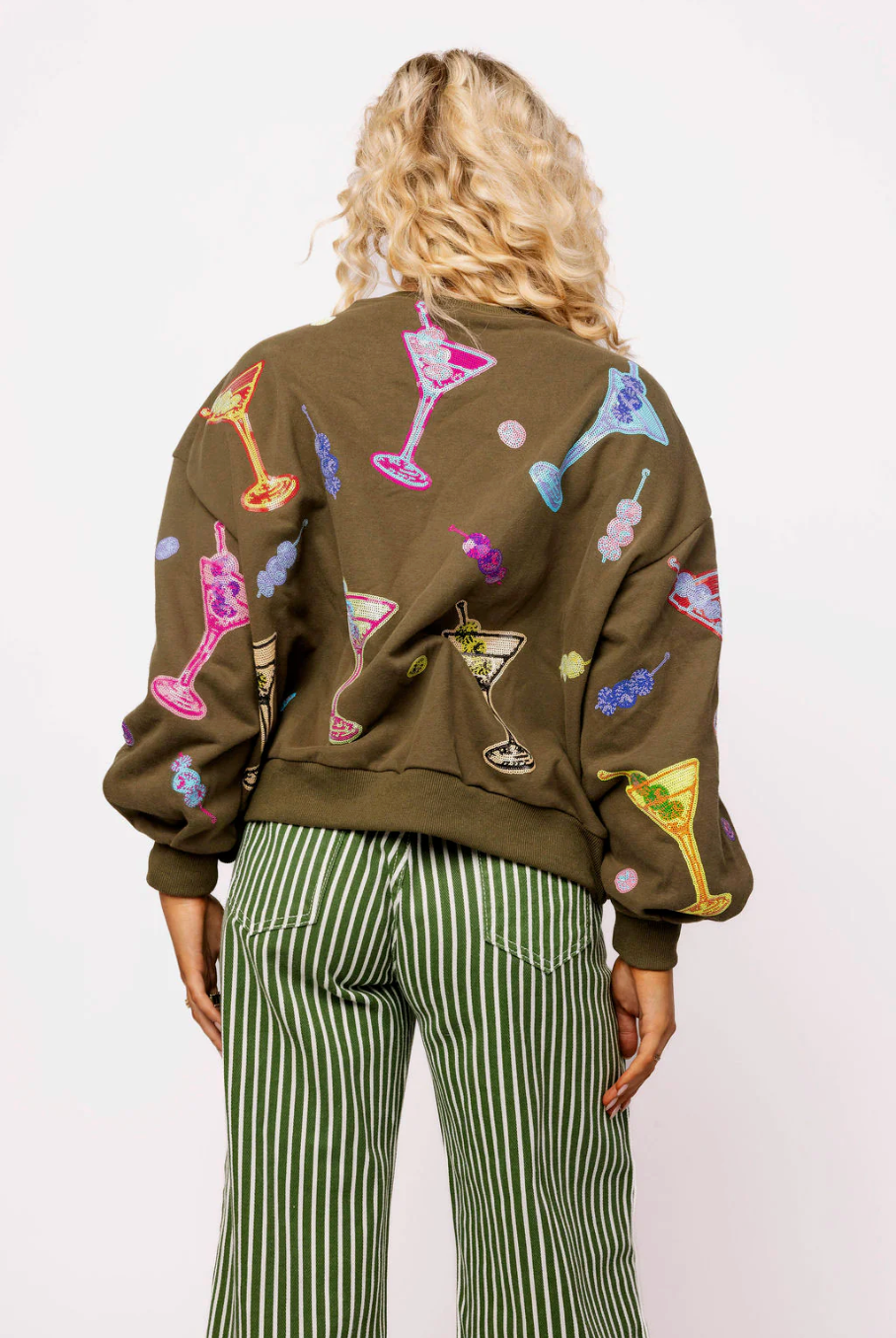 Raise a glass to style with this chic Multi Martini Sweatshirt in olive green. Adorned with shimmering sparkles that catch the light, this cozy piece brings a touch of glamour to your everyday wardrobe. Perfect for cocktail lovers and fashion enthusiasts alike, it's the ideal way to celebrate your love of martinis with a playful, sophisticated flair. Slip it on for a night out or casual gatherings—comfort meets elegance in every wear.
