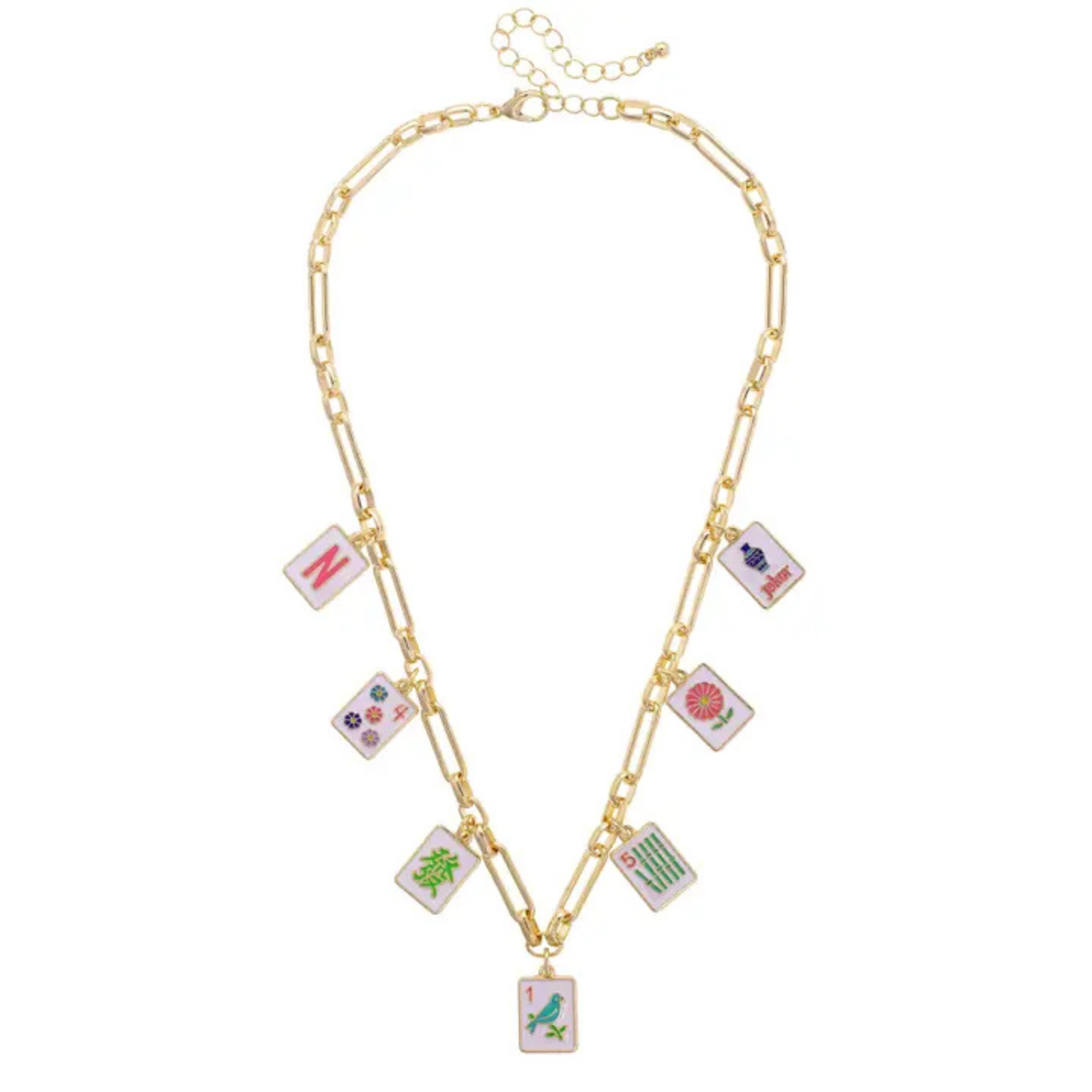 Bring the table to your neckline with this multi-colored Mahjong charm necklace, showcasing a mix of iconic tiles on a gold chain. A lively, conversation-starting accessory for any fan of the game.